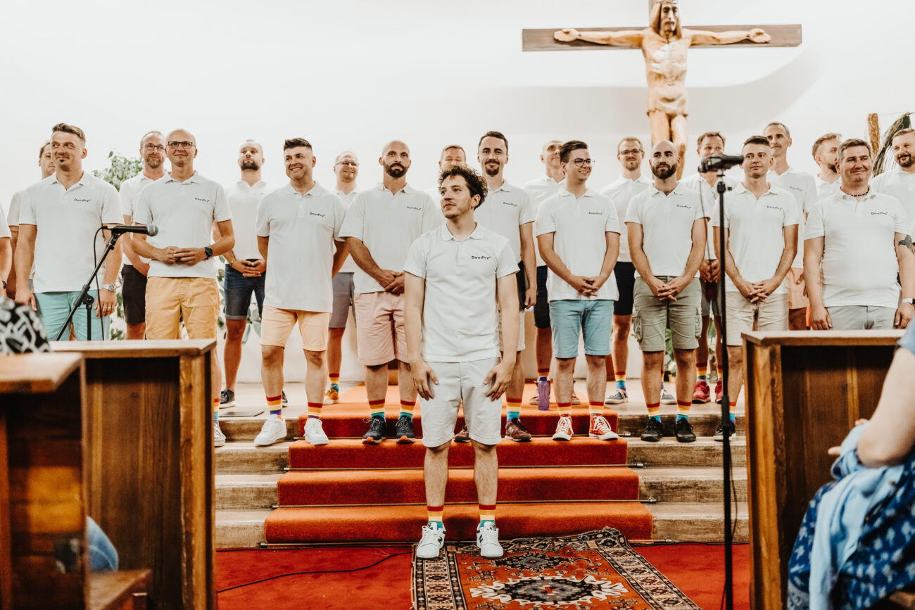 En tant que seule chorale gay masculine de République tchèque, nous nous engageons à éliminer les préjugés sociaux associés à la communauté queer. Nous pensons que la musique nous aide à trouver un terrain d’entente avec nos détracteurs, en créant un environnement propice à un dialogue constructif. Ce faisant, nous démontrons que le respect mutuel est le fondement d’une société où chacun peut être soi-même, une société où il fait bon vivre. Ces dernières années, nous nous sommes produits à Berlin, Nuremberg, Varsovie, Cracovie, Bologne et dans d’autres villes européennes. Nous ne nous limitons pas aux concerts traditionnels, vous pouvez donc également nous voir nous produire dans des maisons de retraite ou lors des cérémonies de mariage de nos fans.